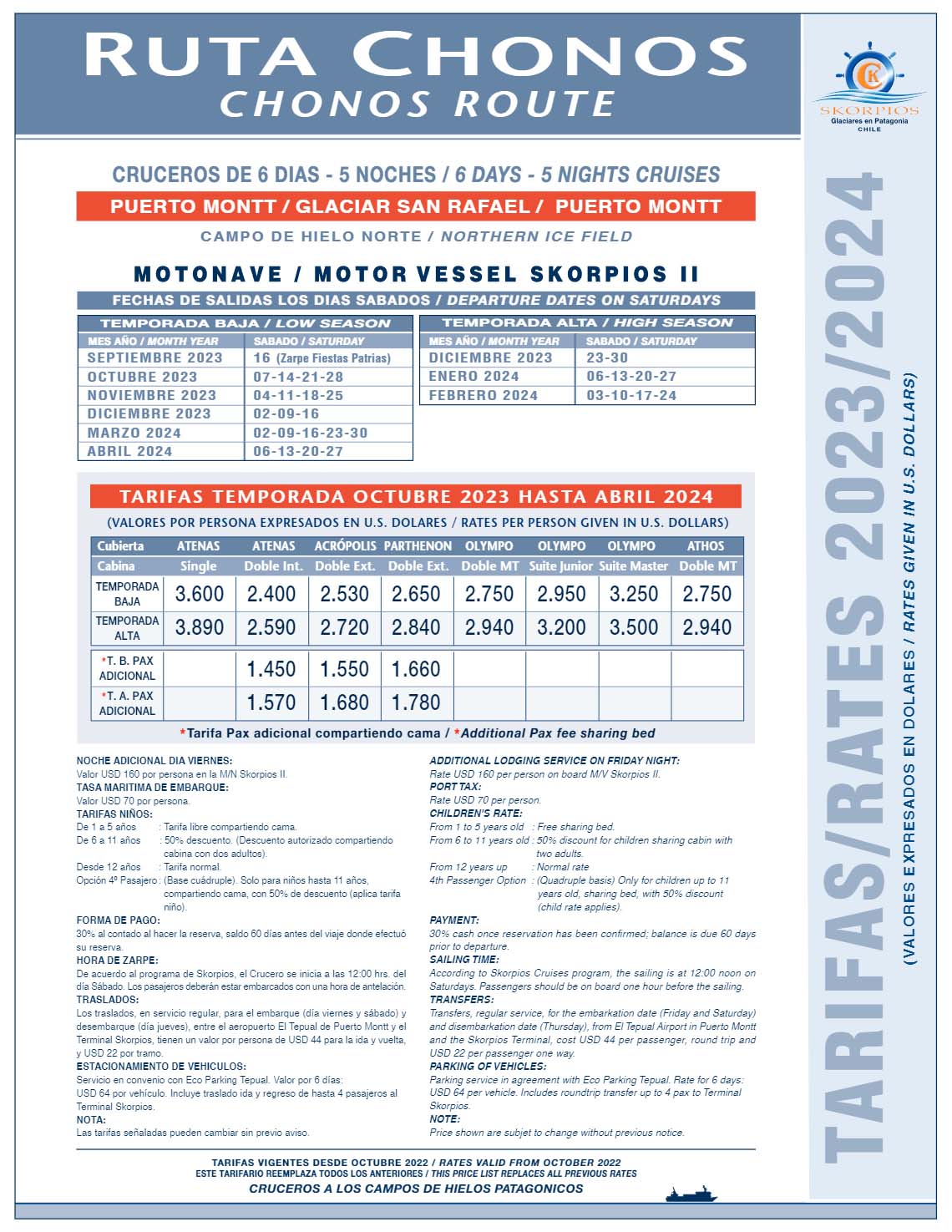 Skorpios II is designed to cruise the icy waters of Chile's fjords, for its 160 passengers in 55 cabins, its open decks provide a magnificent view of magnificent landscapes. It has five decks, Athens, Acropolis, Parthenon, Olympo and Athos. All cabins have private baths, heating, international phone system, TV, ventilation system, background music. All decks except the Athens have windows. You will be pampered with the fine onboard dining in the spacious dining room. International menus are complimented by fine Chilean wines.